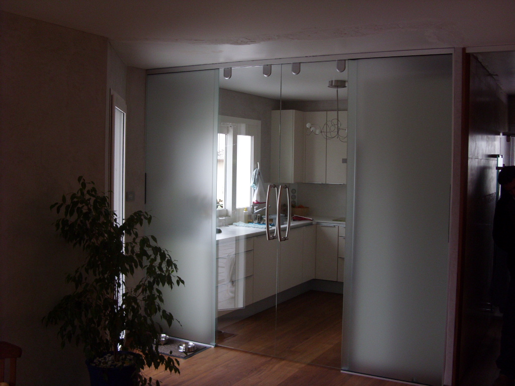 Une porte classique entre cuisine et séjour peut-être avantageusement remplacée par une porte tout verre, montée sur paumelles ou pentures , et complétée ou non par une décoration sablée.